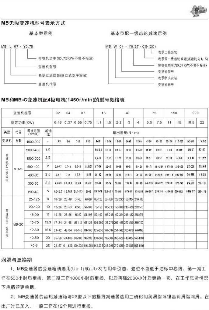 MB無級變速機(jī)型號表示法MB和MB-C變速機(jī)配4極電機(jī)(1450r/min)的型號規(guī)格表潤滑和更換期
